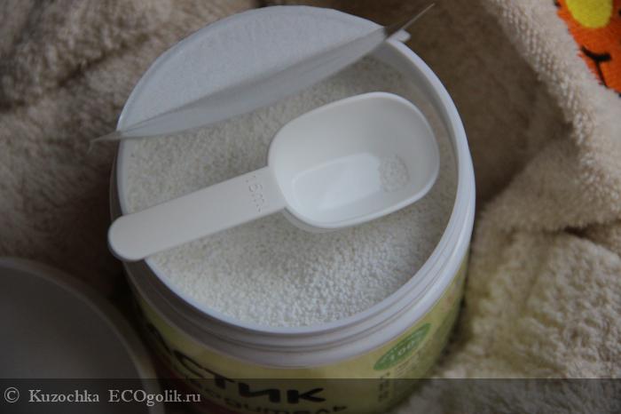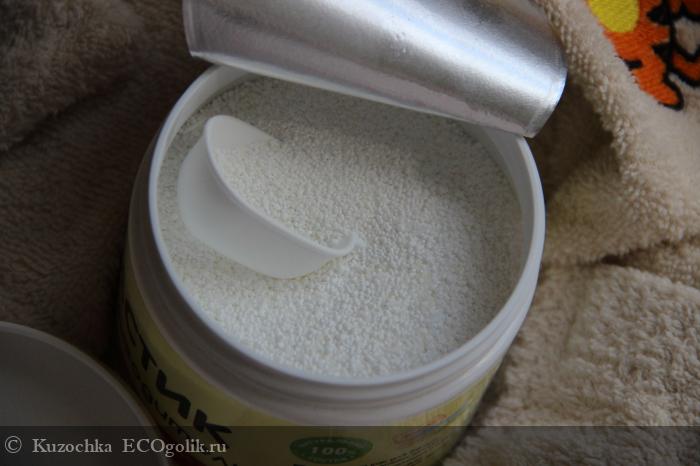 Пятновыводитель представляет собой гранулированный порошок белого цвета, почти без запаха. Объем ложечки 15 мл, обычно на стирку я добавляю полную ложку без горки. Ластик использую для стирки цветных вещей с пятнами или общей загрязненностью. Эффект будет заметней, если стирать в горячей воде (выше 50 градусов).