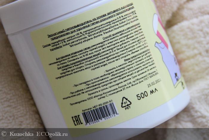 Пятновыводитель Ластик - экологичное средство и полностью разлагается в окружающей среде. Продукт обладает еще рядом полезных свойств: не разрушает волокна ткани, не вызывает коррозию барабанов стиральных машин, смягчает воду. А также не смердит и не пылит