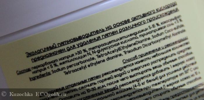 Состав: перкарбонат натрия > 30% (Sodium Percarbonate), тетраацетилэтилендиамин 5-15% (Tetra Acetyl Ethylene Diamine), кокосульфат натрия < 5% (Sodium Cocosulfate), метилглицин N (Sarcosine), тринатриевая соль N-диуксусной кислоты < 5% (Trisodium Dicarboxymethyl Alaninate)