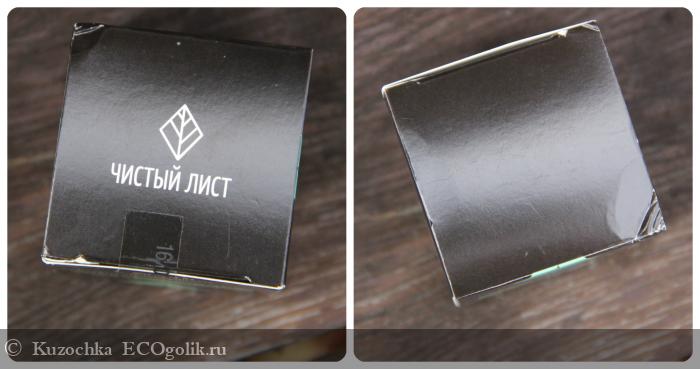 Стеклянная баночка помещена в картонную коробочку, как и остальные средства линии Чистый лист. В случае с сыворотками для лица и век коробочки выглядели хорошо, а вот для маски стенки упаковки слишком тонкие, и при транспортировке уголки немного помялись. Грани коробки несут на себе информацию: описание, способ применения, состав, контакты производителя.