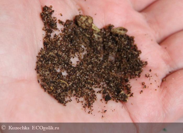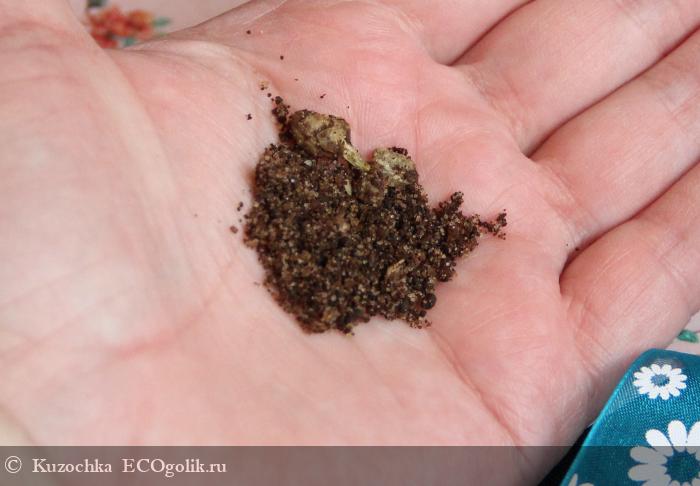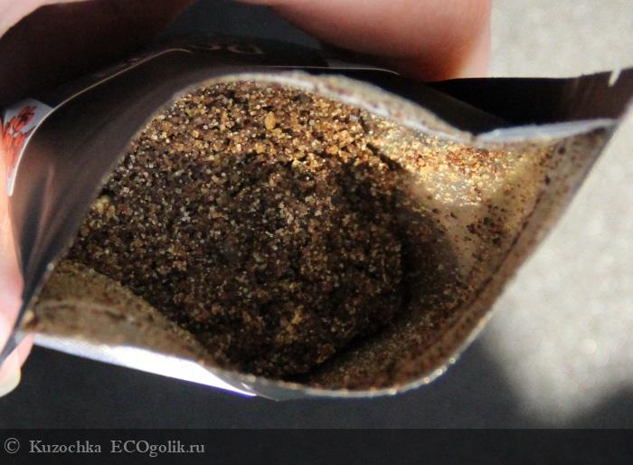 Первое, на что я обратила внимание - необычный цвет скраба, в сравнении с другими кофейными. Тут смесь более светлая за счет содержания янтаря