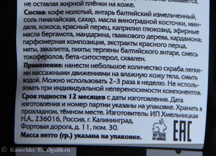 Состав: кофе молотый, янтарь балтийский измельчённый, соль гималайская, сахар, масла виноградной косточки, миндаля, кокоса; красный перец, каприлил глюкозид, эфирные масла бергамота, мандарина, гваякового дерева, кардамона; парфюмерная композиция, экстракты красного перца, мяты, эвкалипта, пихты; терпены балтийского янтаря, смесь токоферолов, бета-ситостерол, сквален.