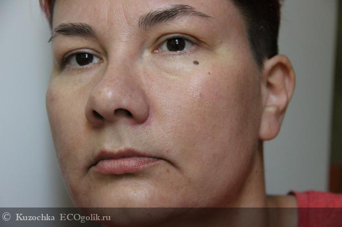 Поры сглажены (видимо, заслуга каламина). Была бы такая кожа хотя бы часа четыре - поставила бы пять продукту.