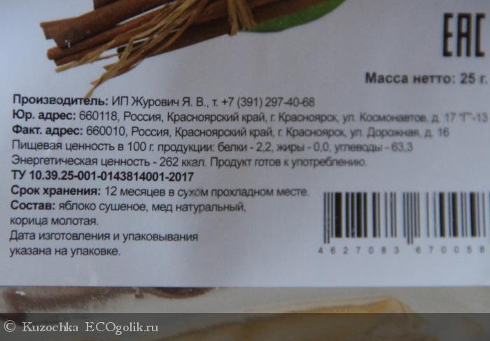 Состав прост: яблоко сушеное, мед натуральный, корица молотая. Масса 25 г, срок годности 12 мес., цена около 100 руб (точно таких не нашла, только похожие).