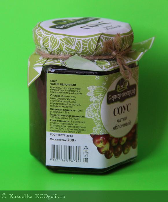 Изучая ассортимент Фермер-центра наткнулась на различные сладкие соусы. Выбор пал на Яблочный чатни. Прочла состав, мне он показался интересным, и я взяла соус на пробу. Продукт весом 200 г находится в шестигранной стеклянной банке с жестяной закручивающейся крышкой. На крышке бумажная этикетка, перевязанная веревочкой. Выглядит очень даже симпатично.