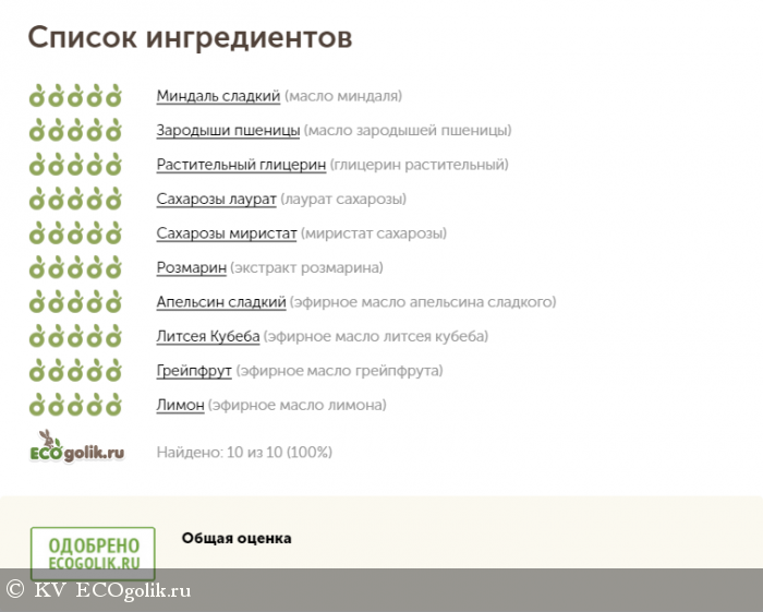 Состав: масло миндаля, масло пшеничных зародышей, глицерин растительный, лаурат сахарозы, миристат сахарозы, СО2 экстракт розмарина, эфирное масло апельсина сладкого, эфирное масло литзеи, эфирное масло грейпфрута, эфирное масло лимона.
