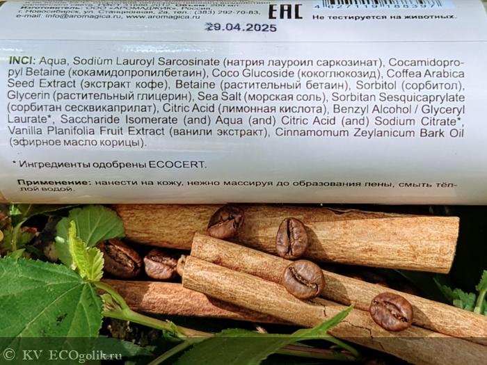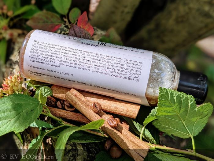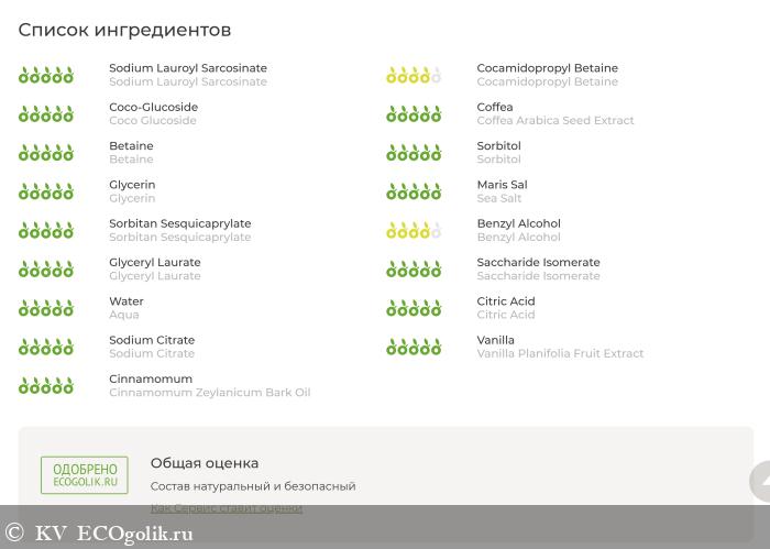Состав: Aqua, Sodium Lauroyl Sarcosinate (натрия лауроил саркозинат), Cocamidopropyl Betaine (кокамидопропилбетаин), Coco Glucoside (кокоглюкозид), Coffea Arabica Seed Extract (кофе экстракт), Betaine (растительный бетаин), Sorbitol (сорбитол), Glycerin (растительный глицерин), Sea Salt (морская соль), Sorbitan Sesquicaprylate (сорбитана сесквикаприлат), Citric Acid (лимонная кислота), Benzyl Alcohol / Glyceryl Laurate, Saccharide Isomerate (and) Aqua (and) Citric Acid (and) Sodium Citrate*, Vanilla Planifolia Fruit Extract (ванили экстракт), Cinnamomum Zeylanicum Bark Oil (эфирное масло корицы).