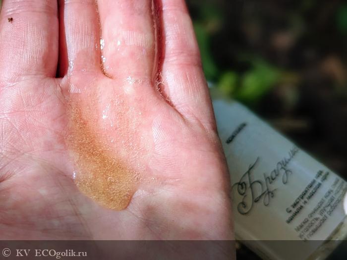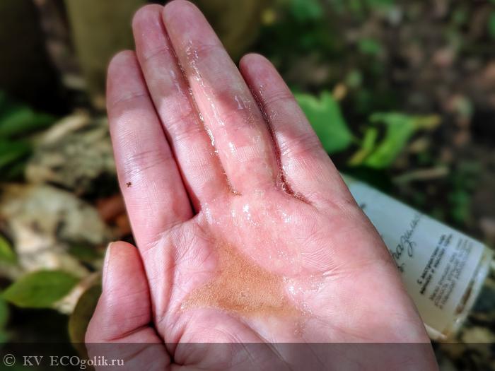 Консистенция ближе к жидкой, слегка текучая, но не убегающая сквозь пальцы. Гель комфортно наноситься непосредственно на влажное тело и распределяется, окутывая сначала будто шелковисто-нежным молочком, которое уверено превращается в пенку.
