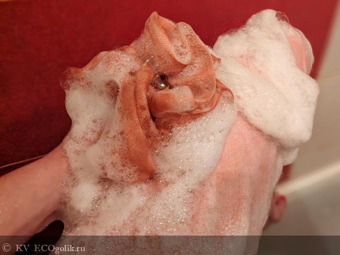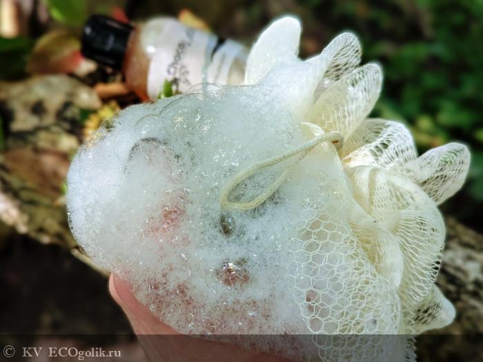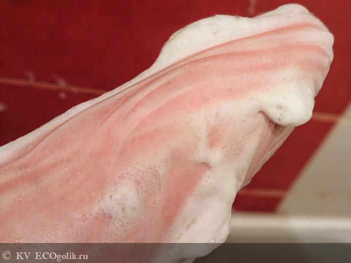 Ах, какая же волшебная, пышная и заботливая пена получается на мочалке! Ее много, по ощущениям пенка очень мягкая, необычайно нежная и бархатистая, и это воздушное суфле держится долго-долго, мне нравится по ней сделать еще и самомассаж руками.