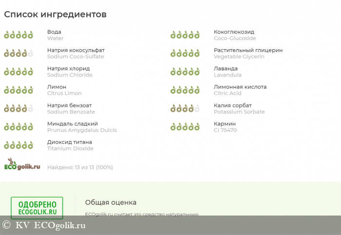 Ingredients(состав): Aqua(вода очищенная), Cocoglucoside (кокогликозид), Sodium Coco-Sulfate (кокосульфат натрия), Glycerin (глицерин растительный), SodiumChloride (соль пищевая), Lavender Oil (эфирное масло лаванды), Lemon Oil (эфирное масло лимона), Citric Acid (лимонная кислота), Sodium Benzoate (бензоат натрия), Potassium Sorbate (сорбат калия), Almond Kernel Powder (скорлупа миндального ореха), Carmine (натуральный краситель), Titanium Dioxide (минеральный краситель).