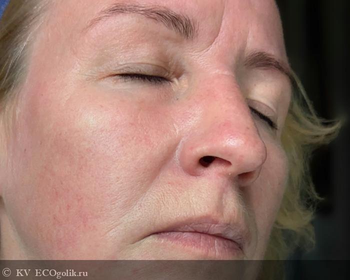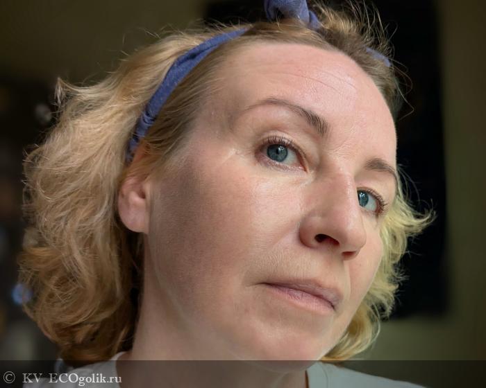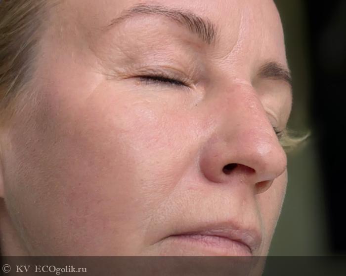 На лице он выглядит очень свежо, оставляя едва заметный влажный, деликатно сияющий сатиновый финиш. Крем выравнивает тон кожи, делает текстуру более гладкой, убирает тусклость, следы усталости. Для меня особенно важно и ценно, что ВВ абсолютно не подчеркивает морщины, не затекает в заломы и не привлекает излишнего внимания к порам, напротив маскирует все эти нюансы. И не жирнит, и не сушит, не подчеркивает шелушений, более того дает дополнительное увлажнение, что тоже немаловажно.