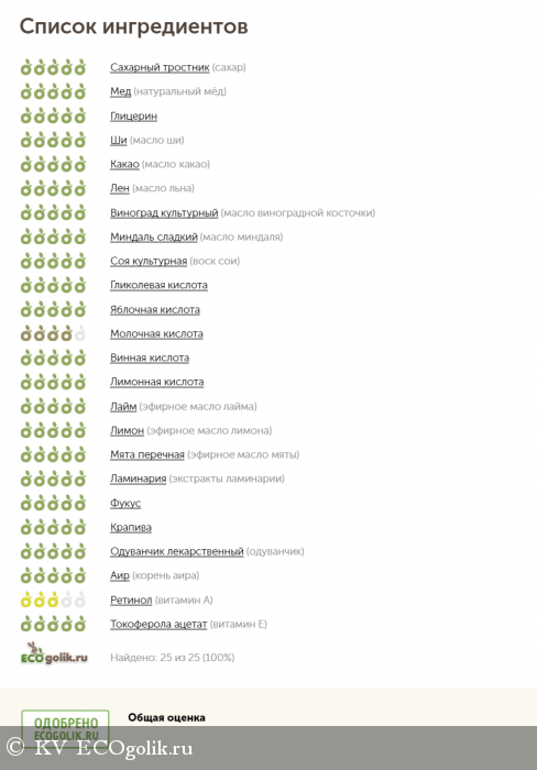 Состав: сахар, натуральный мёд, глицерин, растительные масла (ши, какао, льна, виноградной косточки, миндаля), воск сои, комплекс фруктовых кислот (гликолевой, яблочной, молочной, винной, лимонной) и их солей, мята (порошок), эфирные масла (лайма, лимона и мяты), СО2 экстракты (ламинарии, фукуса, крапивы, корня одуванчика и аира), витамины А и Е.
