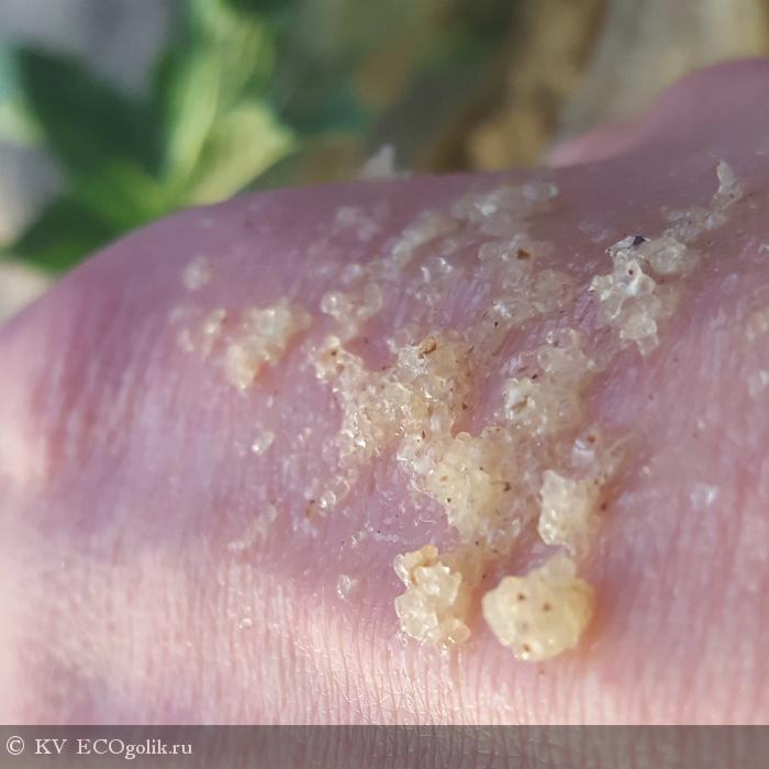 Сахар и кусочки мяты достаточно пропитаны маслами, чтоб не распадаться при нанесении на тело, и в тоже время жирной пленки не остается.