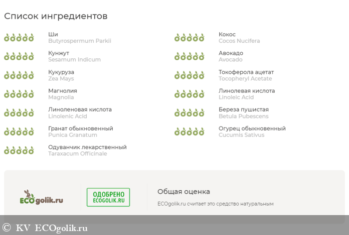 В составах марки я давно не сомневаюсь, но ради традиции прикладываю ссылочку на разбор https://ecogolik.ru/sostav_kosmetika/result/24921... Состав - продуманное сочетание питающих, увлажняющих и смягчающих масел и экстрактов совмещающих успокаивающие и уходовые свойства.