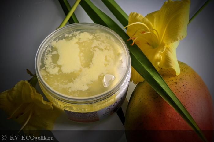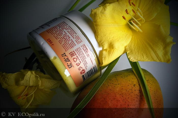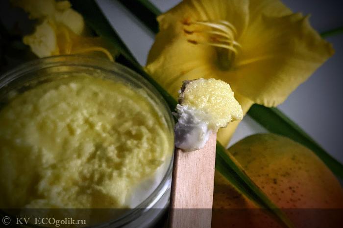 Скрабирующая основа тут многокомпонентная: тростниковый сахар мелкого помола замешан с органическими экстрактами манго, маракуйи, ананаса, плюс еще и косточки маракуйи.