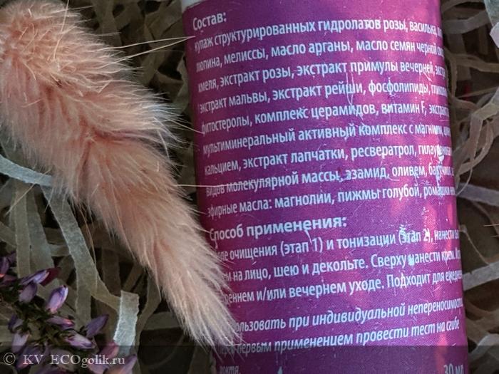 Состав: купаж структурированных гидролатов розы, василька, липы, зеленого чая, люпина, мелиссы, масло арганы, масло семян черной смородины, мацерат хмеля, экстракт розы, экстракт примулы вечерней, экстракт бархатцев, экстракт мальвы, экстракт рейши, фосфолипиды, гликолипиды, глицин сои, фитостеролы, комплекс церамидов, витамин F, экстракт лаванды, мультиминеральный активный комплекс с магнием, цинком, медью и кальцием, экстракт лапчатки, ресвератрол, гиалуроновая кислота трех видов молекулярной массы, азамид, оливем, коллоидное золото, шаромикс 721, эфирные масла магнолии, пижмы голубой, ромашки немецкой, лаванды.