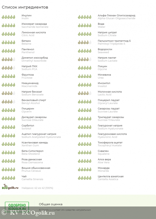 Состав/INCI: Aqua, Inulin (and) Alpha-Glucan Oligosaccharide*, Saccharide Isomerate (and) Aqua (and) Citric Acid (and) Sodium Citrate*, Natural Betaine, Palmitoyl Tripeptide-5 (and) Panthenol (and) Sodium Hyaluronate (and) Algae (Dunaliella Salina) Extract, Dimethyl Isosorbide, Sodium Lactate (and) Sodium PCA (and) Glycine (and) Fructose (and) Urea (and) Niacinamide (and) Inositol (and) Sodium Benzoate (and) Lactic Acid, Benzyl Alcohol (and) Glyceryl Laurate*, Glycerin (and) Sucrose Laurate (and) Sucrose Dilaurate (and) Sucrose Trilaurate (and) Sorbitol*, Sodium Hyaluronate (and) Sodium Acetylated Hyaluronate (and) Hydrolyzed Hyaluronic Acid, Xantan Gum, Tocopherol (and) Beta-Sitosterol (and) Squalene*, Rosa Affinis Rubiginosa Oil (эфирное масло розы), Aloe Barbadensis Extract (алоэ вера экстракт СО2), Prunus Cerasus Extract (испанской вишни экстракт СО2), Monarda Didyma Leaf Extract (монарды экстракт СО2), Camellia Sinensis (White Tea) Extract (белого чая экстракт СО2), Centella Asiatica Extract (центеллы азиатской экстракт СО2).