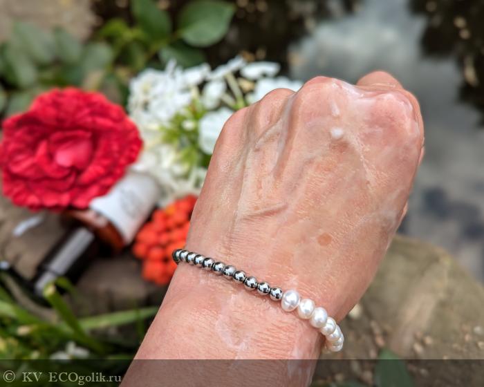 По консистенции молочко именно то, что надо - выверенное соотношение, достаточно жидкое, чтобы без труда разноситься по коже, но при этом оно хорошо "держится", не пытаясь убегать и капать. А под воздействием воды слегка эмульгируется, становясь еще более невесомым и ласковым.