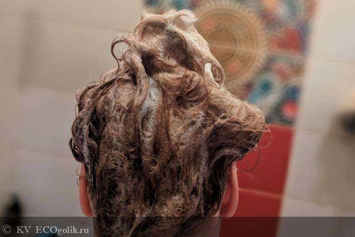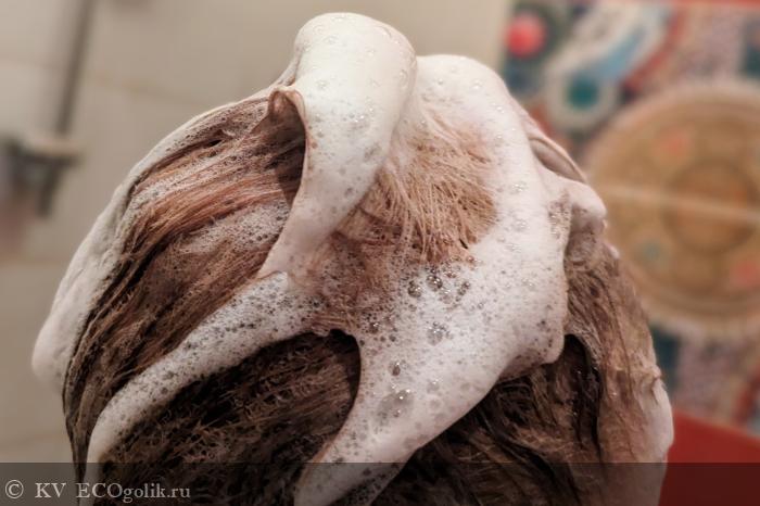 Смывается легко, и сразу чувствуется, что волосы прям чистые, свежие, а кожа головы дышит. Шампунь моет чуть ли не до скрипа, при этом не сушит! Очищение деликатное - как бы я не взбивала шевелюру при намыливании, волосы не путаются, остаются мягкими и послушными, насколько это возможно без всякого последующего ухода.