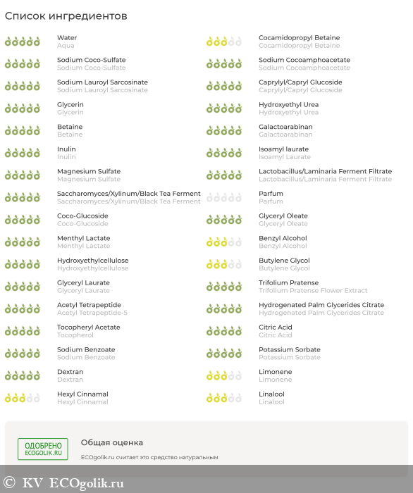 Состав: Aqua (Water), Cocamidopropyl Betaine, Sodium Coco-Sulfate, Sodium Cocoamphoacetate, Sodium Lauroyl Sarcosinate, Caprylyl/Capryl Glucoside , Glycerin, Hydroxyethyl Urea, Betaine, Galactoarabinan, Inulin, Isoamyl Laurate, Magnesium Sulfate, Lactobacillus/Laminaria Ferment Filtrate, Saccharomyces/Xylinum/Black Tea Ferment, Parfum, Coco-Glucoside, Glyceryl Oleate, Menthyl Lactate, Benzyl Alcohol, Hydroxyethylcellulose, Butylene Glycol, Glyceryl Laurate, Trifolium Pratense (Clover) Flower Extract, Acetyl Tetrapeptide-5, Hydrogenated Palm Glycerides Citrate, Tocopherol, Citric Acid, Sodium Benzoate, Potassium Sorbate, Dextran, Limonene, Hexyl Cinnamal, Linalool.