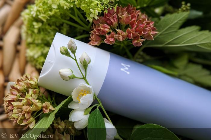 Сам шампунь разлит в стройный флакон, исполненный в минималистичном стиле и очень красивом лавандовом оттенке.