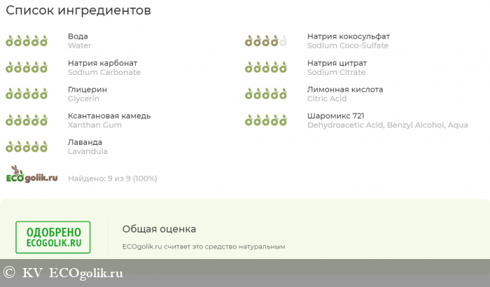 вода (Water), кокосульфат натрия (SodiumCocosulfate), кальцинированная сода (SodiumCarbonate), цитрат натрия (SodiumCitrate), глицерин (Glycerin), лимонная кислота (CitricAcid), ксантановая камедь (XanthanGum), зеленый консервант Sharomix 721 (DehidroaceticAcid, BenzylAlcohol), натуральный ароматизатор на основе компонентов эфирного масла лаванды (LavandulaDentata (FrenchLavender) OilComponents).