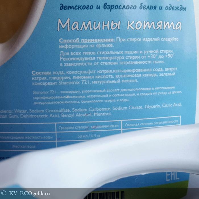 Гель Мамины котята практически ни чем не отличается от Большой стирки - состав то почти идентичен - разница только ментол. Поэтому и аромат у геля ментолово-мятный - он не взрывной, но все же искрится свежестью, на вещах едва заметен - лишь отголоски.