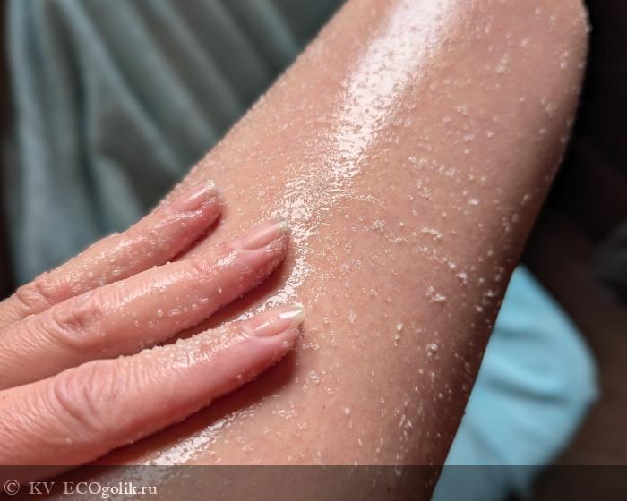 Я люблю использовать скраб на хорошо распаренную, чистую кожу (хоть бы и в душе), беру его небольшими порциями и плавно разношу по лимфотоку на влажное тело.