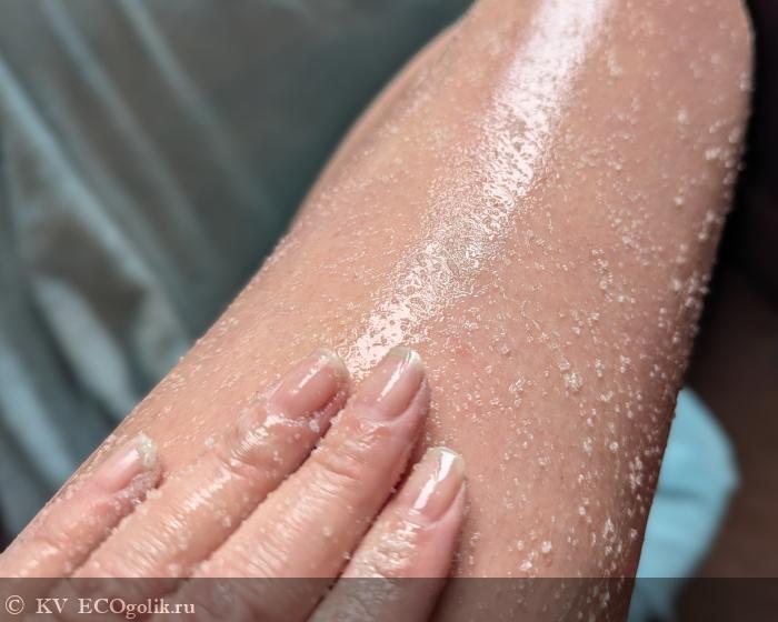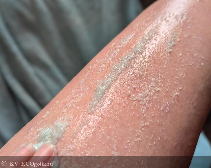 В этом случае скраб практически не осыпается, хорошо сцепляется с кожей, при этом он не притормаживает, как бы скользит и растягивается по довольно большой поверхности.