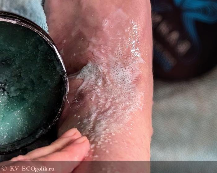 Я предпочитаю скрабирование пожестче, поэтому во время процедуры дополнительно влагу не добавляю, но это не возбраняется, если вы захотите помягче. Эмульгируется скраб минимально, но тем не менее, получающиеся легкое молочко создает нежную подложку, по которой более крупные и жесткие сахарные частики скользят весьма деликатно. Скраб не царапает, не травмирует и не раздражает кожу, он действительно максимально комфортен в применении.