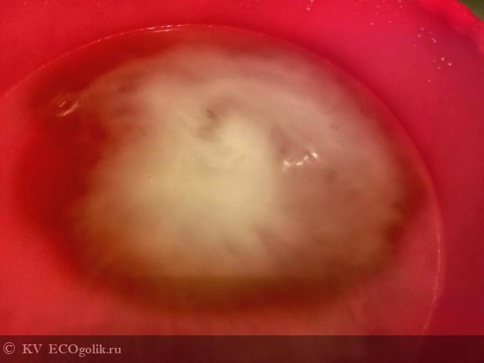 При добавлении горячей воды гранулы растворяются, шипя, пузырясь и давая "дымок" кислородной реакции. Тут очень важно, что бы вода была не прохладнее 60 , но значительно быстрее процесс идет при 80-90 и все равно надо несколько минут.