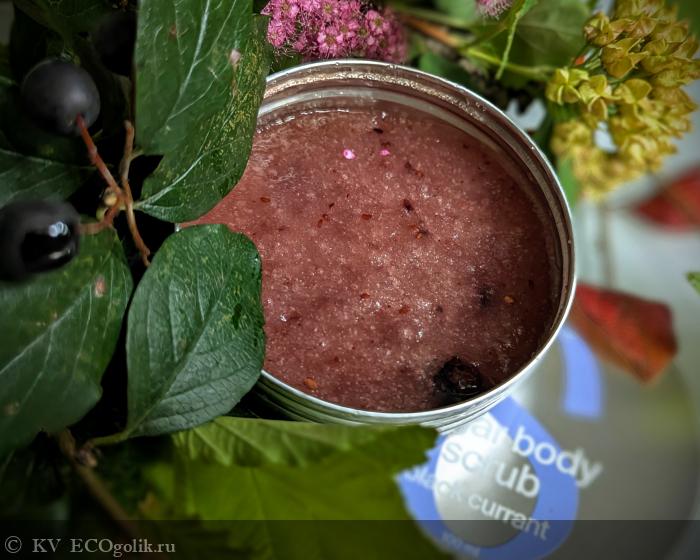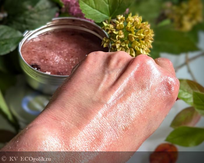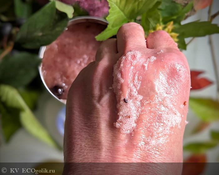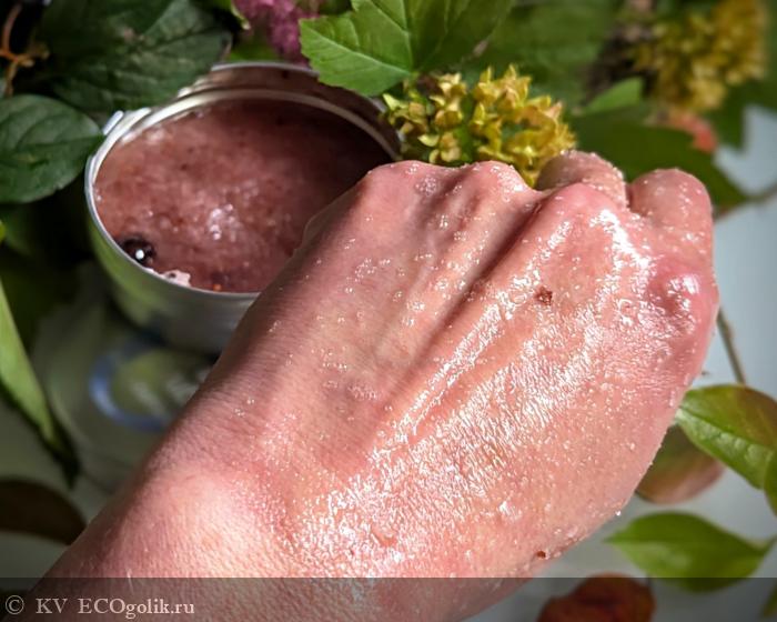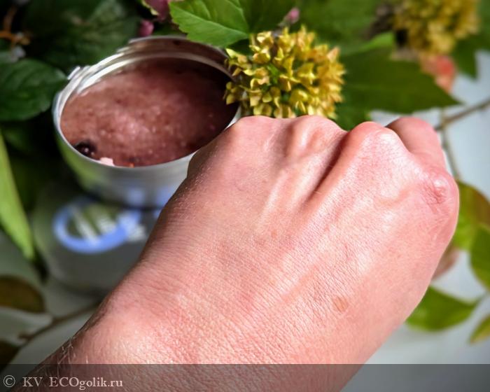 - в скрабе оттенка черносмородинового варенья хорошо видны кусочки сублимированных ягод и помол косточек