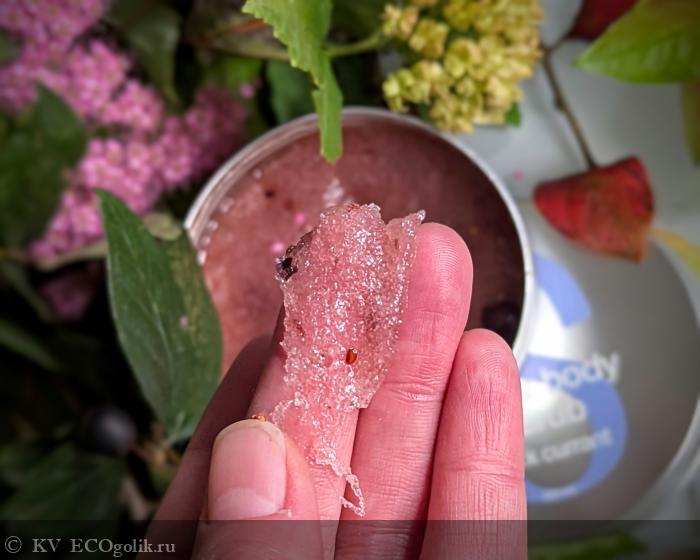 Пользовалась с истинным удовольствием этим скрабом по несколько раз в неделю, обязательно нанося на чистую распаренную в душе кожу. Кристаллы сахара и соли неспешно тают от тепла тела и влаги, а вместе с кусочками ягод, они мягко очищают кожу, плавно отшелушивают омертвевшие клетки. Мне нравится, что он весьма долгоиграющий и позволяет активно проработать все проблемные зоны, и для эффективного антицеллюлитного массажа ему вполне хватает жесткости. Еще нравится, что скраб изменяет свою текстуру в процессе процедуры, со временем становясь почти маслом, дающим классное увлажнение и питание, и при этом не оставляя липкости, жирности и утяжеления. Определенно технологи бренда создали беспроигрышное соотношение скрабирующей основы и масел.