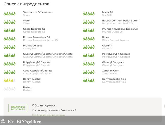 Состав: Sugar* Sea Salt*, Water*, Butyrospermum Parkii Oil*, Cocos Nucifera Oil*, Prunus Dulcis Oil*, Prunus Armeniaca Kernel Oil*, Black Currant Powder* , Cherry Pits*, Glycerin*, Glyceryl Citrate (and) Lactate (and) Linoleate (and) Oleate (and) Polyglyceryl-4 Cocoate (and) Polyglyceryl-3 Caprate (and) Glyceryl Caprylate*, Coco-Caprylate/Caprate*, Xanthan Gum*, Benzyl Alcohol (and) Dehydroacetic Acid**, Food Flavoring (пищевой ароматизатор).