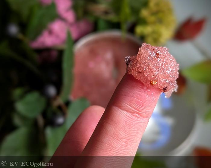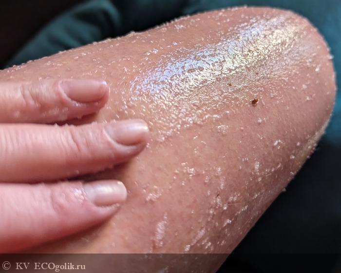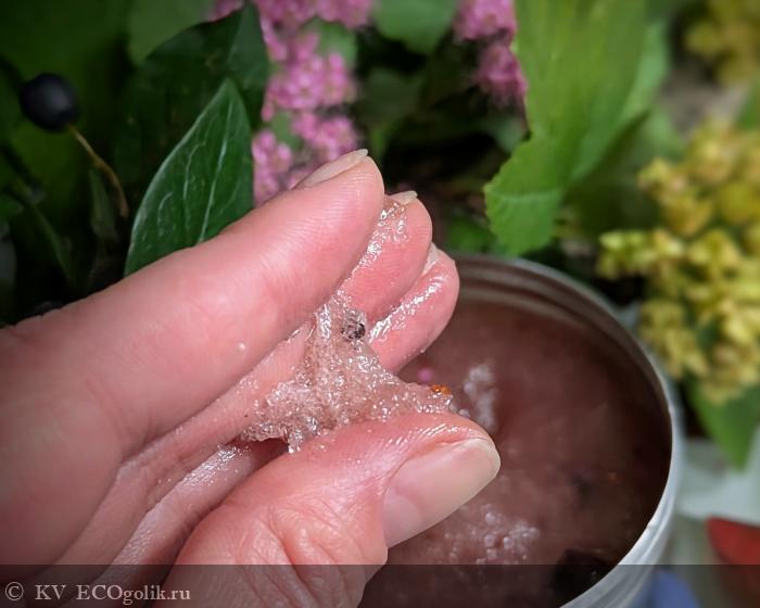 Основные абразивы - крупинки сахара и соли сразу прощупываются на пальцах, но помол деликатный, без острых краев - не колются и не царапаются, а с учетом нежнейшей тягучей консистенции наполненной маслами, он становится еще более нежным и обволакивающим. Хотя в целом я бы отнесла продукт к средней жесткости и питательности - люблю такие варианты именно на теплые деньки.