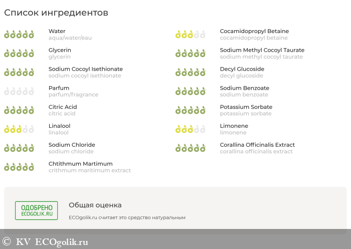 Состав: aqua/water/eau, cocamidopropyl betaine, glycerin, sodium methyl cocoyl taurate, sodium cocoyl isethionate, decyl glucoside, parfum/fragrance, sodium benzoate, citric acid, potassium sorbate, linalool, limonene, sodium chloride, corallina officinalis extract, crithmum maritimum extract