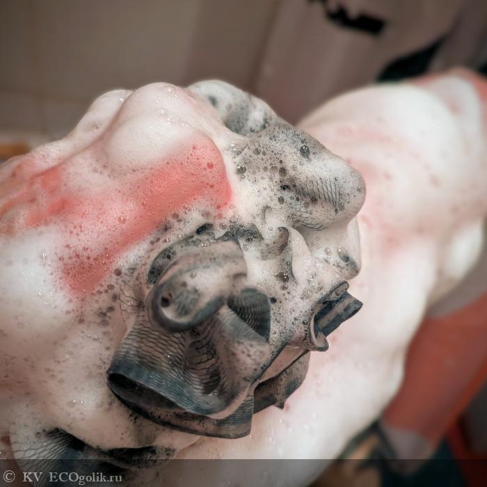 Я предпочитаю пользоваться мочалкой, на ней пенообразование получается обильное и пышное. Для такой пены достаточно несколько капель геля - расход весьма экономный.