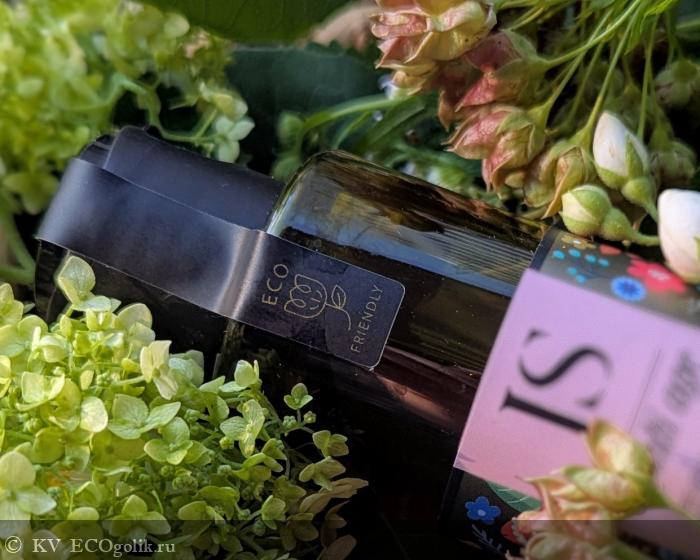 Флакон выполнен из полупрозрачного пластика оттенка extra-verdgin, оборудован откидной крышкой флип-топ. По дизайну он вторит коробочке, правда акцентных цветочных кущ здесь побольше, но они отлично вплетаются в эстетику и не перегружают - получилось нежно, изыскано и оригинально.