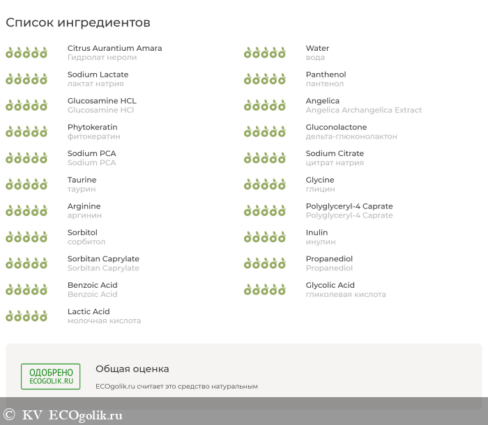 Состав: гидролат нероли (Citrus Aurantium Amara Flower Water), вода (Aqua), лактат натрия** (So-dium Lactate), пантенол (Panthenol), глюкозамин (Glucosamine HCl), экстракт ангелики (Angelica Archangelica Extract), фитокератин* ** (Hydrolyzed Soy and Rice Protein), дельта-глюконолактон** (Delta-gluconolactone), натрия PCA** (Sodium PCA), цитрат натрия (Sodium Citrate), комплекс аминокислот** : таурин, глицин, аргинин (Taurine, Glycine, Arginine), эмолент из кокосового масла* (Polyglyceryl-4 Caprate), сорбитол (Sorbitol), инулин (Inulin), зеленый консервант Nipaguard SCE* (Sorbitan Caprylate, Propanediol, Benzoic Acid), гликолевая кислота (Glycolic Acid), молочная кислота (Lactic Acid).