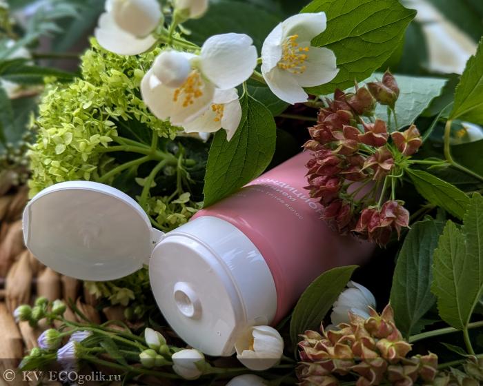 Эстетичная коробочка выполнена в нежный сиренево-розовых тонах, как бы объединяя, содержащиеся внутри шампунь и кондиционер из одной серии. Переживать за несанкционированное вскрытие не стоит, ведь изначально все запаяно слюдой, которую я убрала из немедленного любопытства к продукту, да и блики на фото лишние.