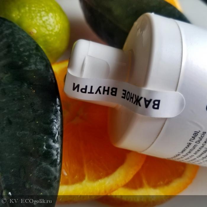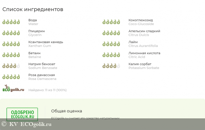 Состав: Aqua (вода), Coco-Glucoside (мягкий ПАВ), Glycerin (глицерин), Citrus Aurantum Dulcis (orange) Oil (эфирное масло апельсина), Xanthan gum (ксантановая камедь), Citrus aurantifolia essential oil (эфирное масло лайма), Betaine (бетаин), Citric acid (лимонная кислота), Sodium benzoate (бензоат натрия), Potassium sorbate (сорбат калия), Rosa essential oil (эфирное масло розы).