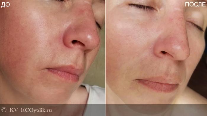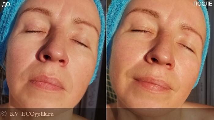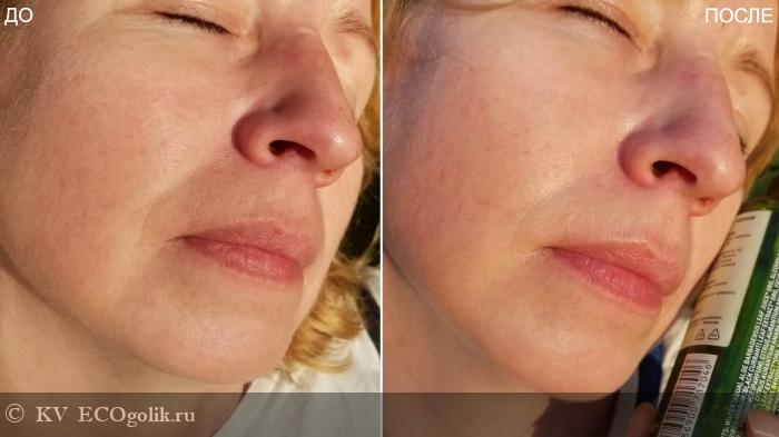Казалось бы, ну что еще хотеть от тоника!? Но и это еще не все - тоник (скорее всего от качественного глубокого увлажнения) умудряется даже подрасправить морщины! И это у меня в мои почти 45 вызывает особый восторг! На фото видно как мягче стала носогубка, ушла сеточка морщинок около глаз.
