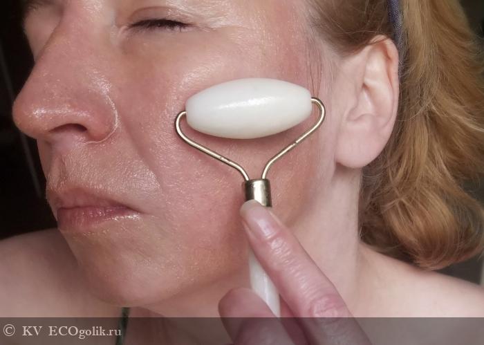 Нашла я и третье применение бальзаму. Конечно, можно просто мягко помассировать пальчиками с добавлением воды, но особенно мне понравилось делать по этому бальзаму массаж с нефритовым роликом. Текстура средства позволяет легко скользить по коже и прорабатывать каждый уголок сколь угодно тщательно. Я выбираю вариант подобной "реанимации", если кожа усталая и помятая. Это быстрый способ привести себя в порядок - подтянуть, наполнить и омолодить. Бальзам в совокупности с массажем эффективно убирает отечность, расправляет заломы и разглаживает морщинки, делает кожу увлажненной, напитанной - придавая ухоженный холеный вид.