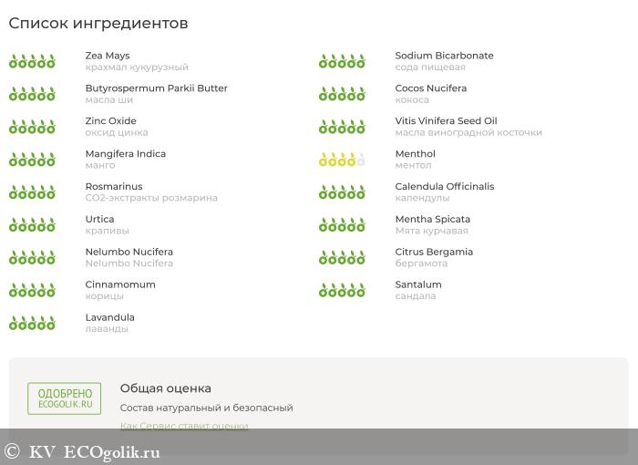 Состав: крахмал кукурузный, сода пищевая, масла ши и кокоса, оксид цинка, масла виноградной косточки и манго, ментол, СО2-экстракты розмарина, календулы и крапивы, эфирные масла мяты курчавой, голубого лотоса, бергамота, корицы, сандала и лаванды.