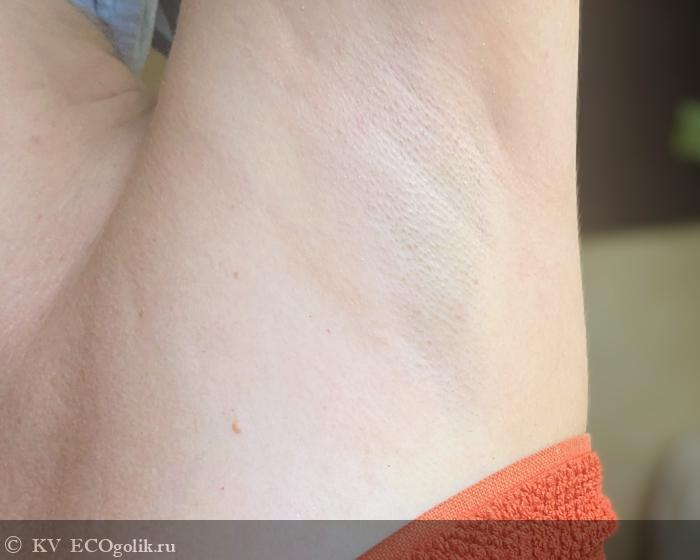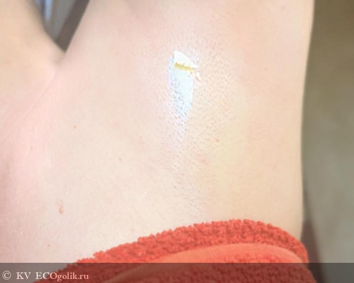 Дезодорант разносится довольно легко, покрывая большую поверхность с маленького зернышка на всю необходимую поверхность. Но! как по мне он все же немного плотноват и необходимо постараться, чтобы распределить его без комочков.