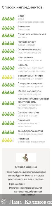 Составы бренда Клеона могу даже не проверять перед использованием - всегда натуральные. Но, для отзыва я сделала проверку. Состав безопасный, сайт не распознал несколько компонентов, они тоже натуральные.