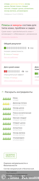 Состав одобрил Экоголик. Средство направлено на маскировку недостатков и выравнивание тона лица, уходовых компонентов мало.