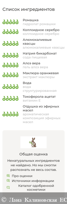 гидролат ромашки, коллоидное серебро, алюмокалиевые квасцы, сода пищевая, гель алоэ вера, экстракт маклюры, настой семян амаранта, вода структурированная, твин 80, витамин Е, ароматическая композиция эфирных масел. Меня удивило, что в составе на первом месте не вода, а гидролат ромашки. Ромашка эффективно успокаивает кожу. Защиту обеспечивают алюмокалиевые квасцы, с ними я уже хорошо знакома. Я давно покупаю дезодоранты на квасцах, мне нравится эффект. После того как я перешла на квасцы у меня наладилось состояние кожи подмышек. Раньше у меня был сильный зуд после бритья, кожа была сухая и грубая. Теперь кожа стала значительно мягче, раздражение и зуд меня совсем не беспокоят. Применение Я наношу дезодорант на чистую и сухую кожу. Пары распылений на одну зону достаточно. Оставляю высохнуть и одеваюсь. Дезодорант не оставляет никаких следов на коже и на одежде. Общие впечатления: Дезодорант эффективно защищает от запаха. Кожа сухая на протяжении дня. После нанесения дезодоранта на коже нет дискомфортных ощущений, пленочки и силиконов. Дезодорант не закупоривает поры. Аромат ненавязчивый, после нанесения едва уловимый. Духи не перебивает. Дезодорант имеет экономичный расход, цена доступная.