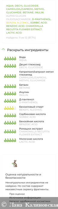 Состав щадящий и сбалансированный, средство подходит для ежедневного применения. Очищающие компоненты "прикрыты" пантенолом, для восстановления кожи, ромашкой, для снятия раздражения, пребиотиками, для восстановления слизистой.