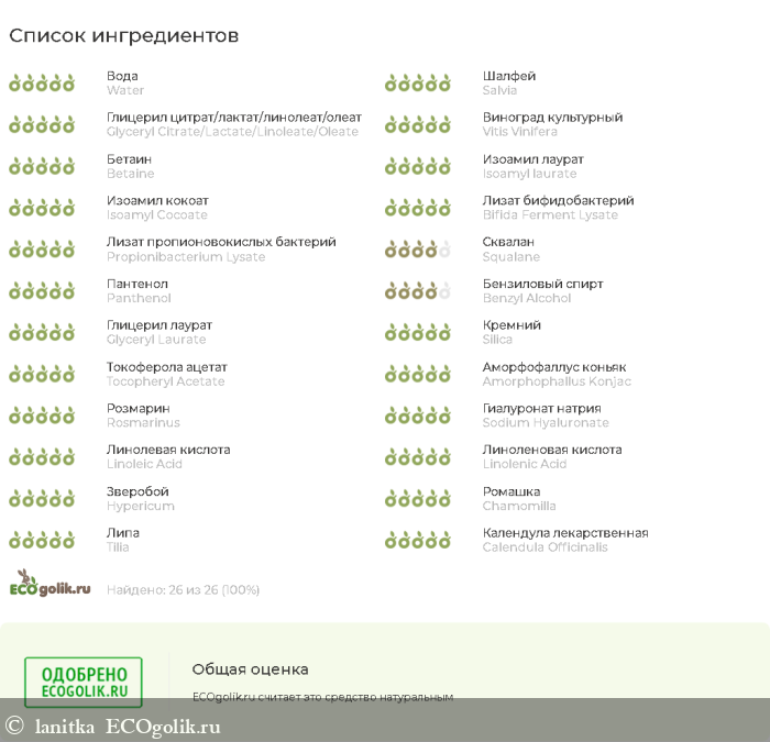 Состав/INCI: Aqua, Salvia Officinalis (шалфея) Flower Water, Calendula Officinalis (календулы) Flower Water, Rosmarinus Officinalis (розмарина) Flower Water, Glyceryl Citrate/Lactate/Linoleate/Oleate*, Vitis Vinifera Seed (виноградной косточки) Oil, Betaine, Isoamyl Laurate (and) Isoamyl Cocoate*, Bifida Ferment Lysate (and) Propionibacterium Lysate, Squalane, Panthenol, Benzyl Alcohol (and) Glyceryl Laurate*, Silica (диоксид кремния), Tocopheryl Acetate (витамин Е), Amorphophallus Konjac Root Powder, Rosmarinus Officinalis Oil (эфирное масло розмарина), Sodium Hyaluronate, Linoleic Acid (and) Linolenic Acid (витамин F), Hypericum Perforatum (зверобоя) Extract, Matricaria Chamomilla (ромашки) Extract, Tilia Cordata (липы) Extract, Calendula Officinalis (календулы) Extract.
